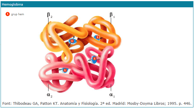 L’hemoglobina (Hb) és una proteïna unida a un pigment responsable del color vermell de la sang, i situada a l’interior de les hematies. Cada molècula d’hemoglobina està formada per 4 subunitats proteiques consistents, cadascuna, en un grup hem (pigment) unit a una globina (cadena polipeptídica), i té 4 àtoms de ferro (Fe), cada un dels quals està localitzat en un grup hem. Com que cada àtom de ferro pot fixar una molècula d’oxigen (O2), en total 4 molècules d’oxigen poden ser transportades a cada molècula d’hemoglobina. La unió entre el ferro i l’oxigen és feble, la qual cosa significa que es poden separar ràpidament en cas necessari. La combinació de l’hemoglobina amb l’oxigen constitueix l’oxihemoglobina.